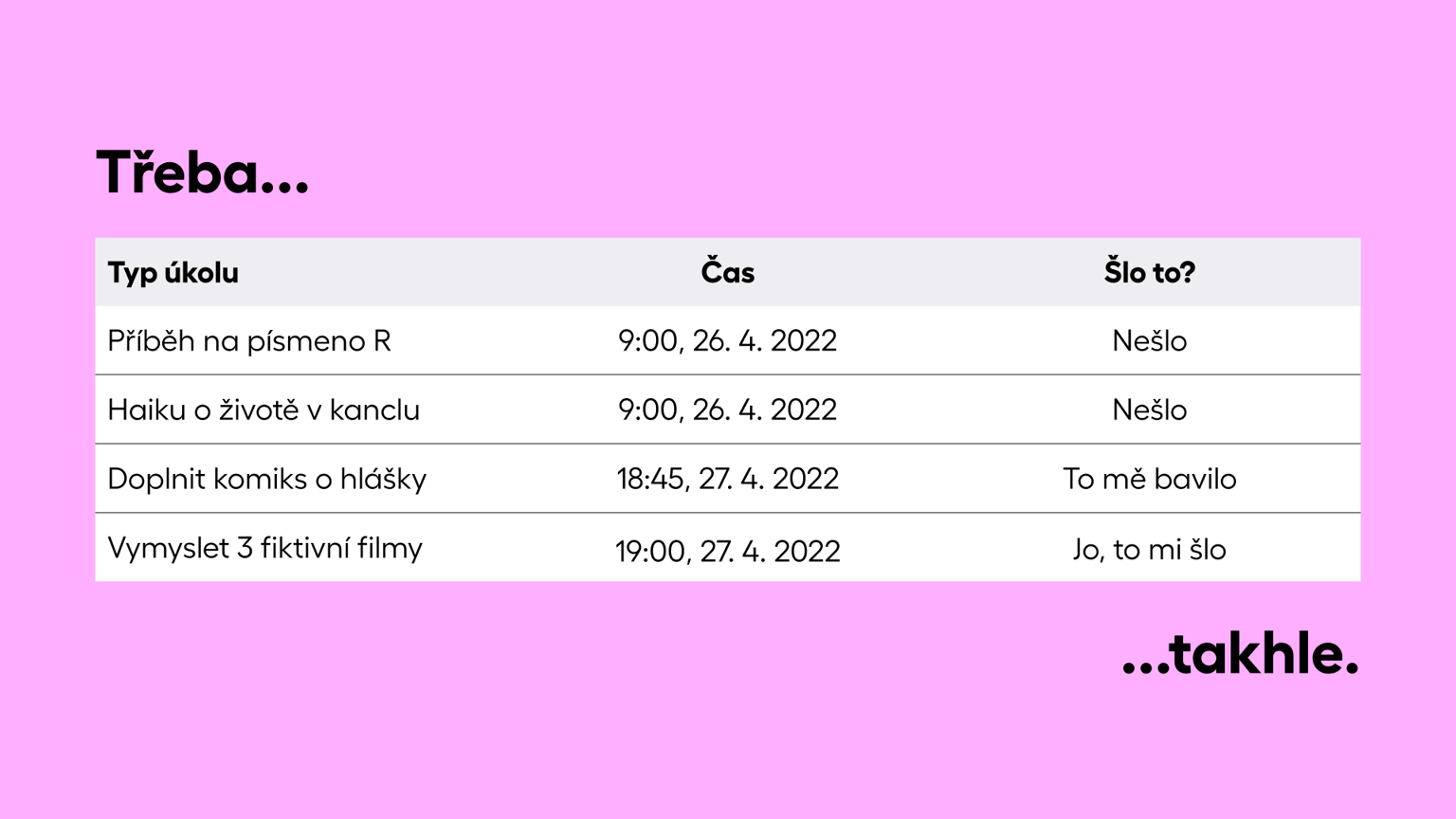 Dobré je si celé snažení zaznamenávat a pozorovat se, kdy a co mi šlo nejlépe. Například do tabulky v Google docu, nebo do diáře.