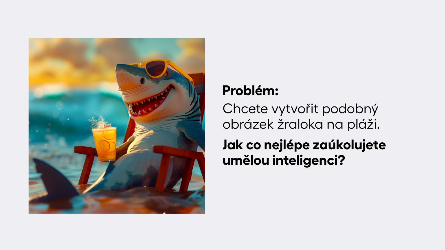Příklad vhodného promptu: Fotorealistický obrázek žraloka s úsměvem a se slunečními brýlemi sedícího na pláži na židli. Pije koktejl, ocas je pod vodou, jasné sluneční světlo, živé barvy, široký záběr, ve stylu UHD --s 250 --ar 1:1