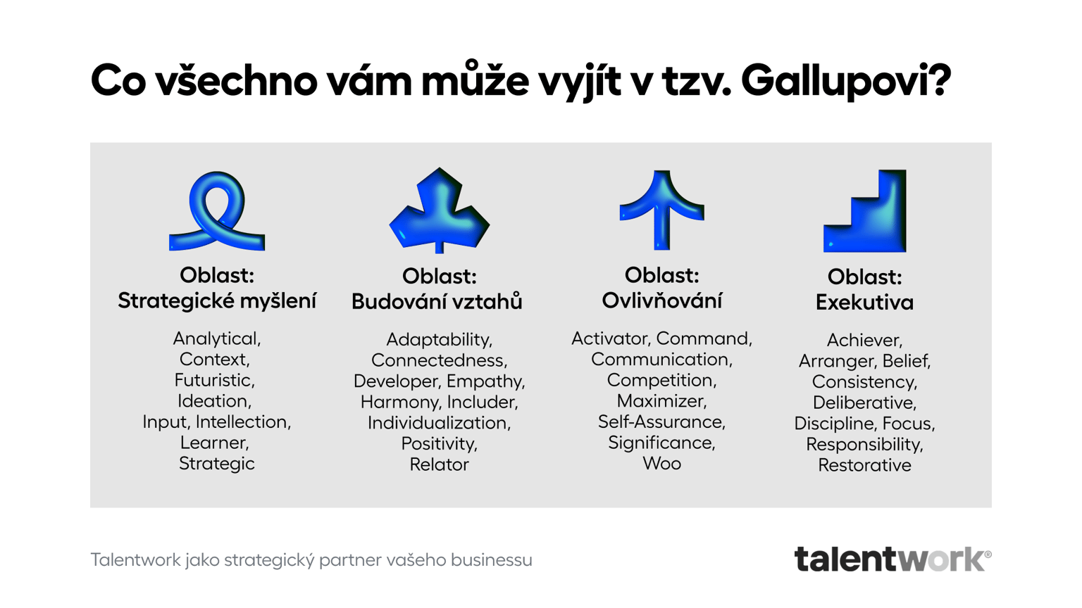 Bez dat o tom, jakým talentem kdo disponuje, se rozvoj vás, ani vašich kolegů konat nebude. Existují desítky typologií na otestování slabých i silných stránek spolupracovníků… …podle Michala Martocha jich ale většina není validních, odvádějí pozornost, mohou i škodit, a v nejlepším případě jde jen o zbytečně vydanou energii a peníze. Za skutečně dobrý testovací rámec Michal považuje tzv. CliftonStrengths 34 od společnosti Gallup. Jedná se o testovací nástroj, který se zaměřuje na identifikaci 10 až 12 vašich talentů, zbylých 10 až 12 identifikovaných stránek jsou ty slabé. Tenhle test navíc vykazuje minimální rozdíly mezi prvním a opakovaným testem, takže i po pár letech můžete očekávat výrazně podobné výsledky. Celkově test zpracovává 34 talentů, které jsou rozdělené do 4 oblastí. Najdete ho na webu Talentworku.