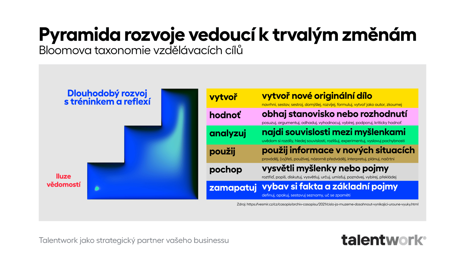 Pro trvalý rozvoj talentů v týmů (ale i ten váš) může pomoci pyramida rozvoje v kombinaci s Bloomovou taxonomií vzdělávacích cílů. Úplně ve zkratce jde o to, že od prvotního zapamatování si nějakých faktů a základních pojmů pak umožníte podřízeným (i sobě) postupně vytvořit něco nového. Pokud zůstanete jen na prvních dvou úrovních Zapamatuj a Pochop, tak vám hrozí, že zabřednete do rozvojového turismu (hezké zážitky, ale přínos pro život či práci minimální). I proto se Petrovi v našem příkladu na začátku nemusel dařit rozvoj. Prostě se učil nové věci, ale už se bál je aplikovat.