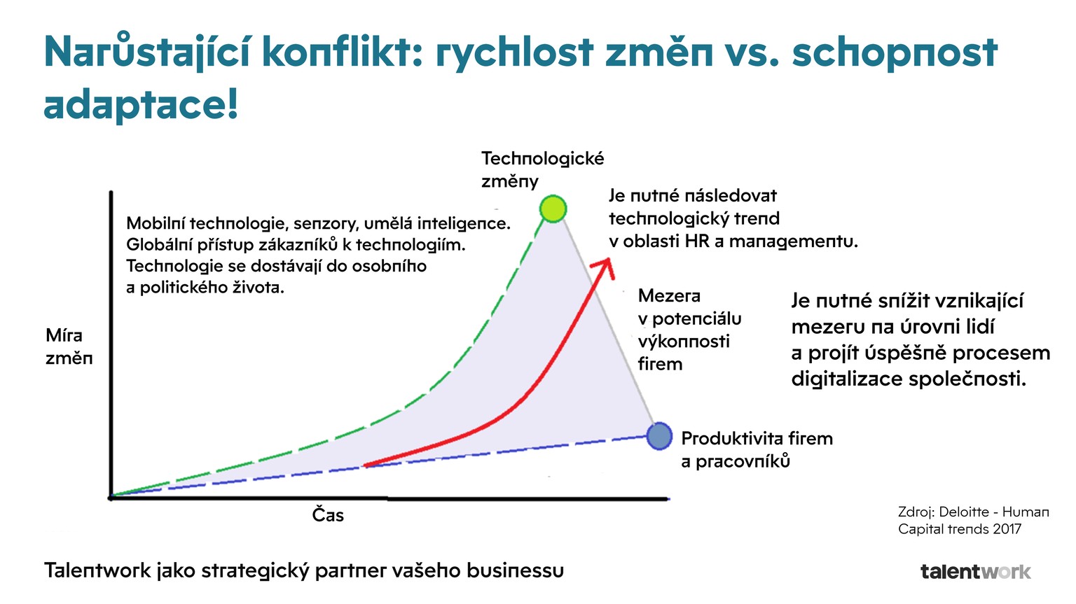 Rychlost změn ale může v týmu (a v osobním životě i společnosti) způsobovat narůstající konflikt mezi počtem technologických změn a udržením produktivity, snadno to může vytvářet nestabilitu a třeba i stagnaci či pokles. Pro znázornění využijme schéma od Deloitte… … co s tím? Zdá se to být docela jednoduché. Jde o to snižovat mezeru mezi změnami a trendy ve vašem oboru. Jakými kroky?