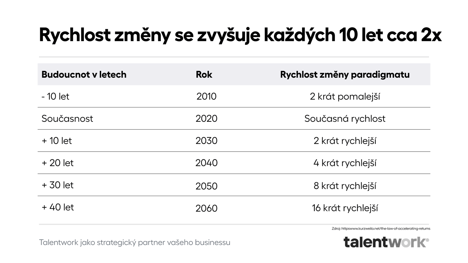 AI, klimatická krize, energetická krize, krize vyvolána ruskou agresí na Ukrajině, krize bydlení, krize všeho. A každá krize sebou nese mimo jiné i prostor pro změnu a implementaci něčeho nového. Podle Raymonda Kurzweila, klíčové postavy tech vývoje Googlu a futurologa, se každých deset let zdvojnásobuje rychlost, s jakou se ve společnosti dějí technologické změny. Takže pokud vám je dneska 30 let a máte v plánu jít do důchodu někdy mezi rokem 2050 až 2060, možná se dočkáte až 16 krát rychlejšího tempa technologických změn.